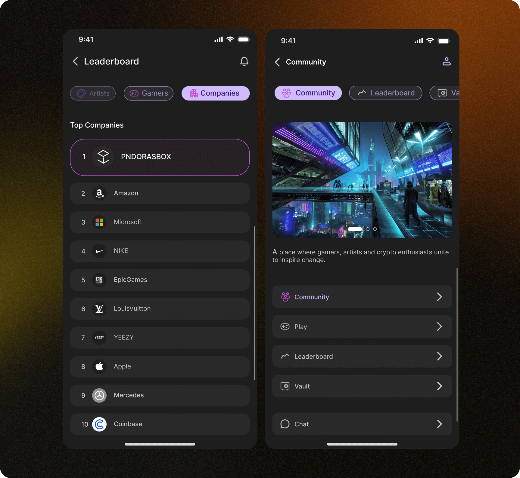 This section showcases the vibrant community experience built into the platform. Users can see their rank on the leaderboard, engage in friendly competition, browse their collections, and chat with fellow players all in one immersive space. The high-fidelity mockups highlight how community features were woven into the user journey, making social interaction as seamless as collecting assets. In this community hub, users not only play and trade, but also were motivated to form meaningful connections to enhance their experience.