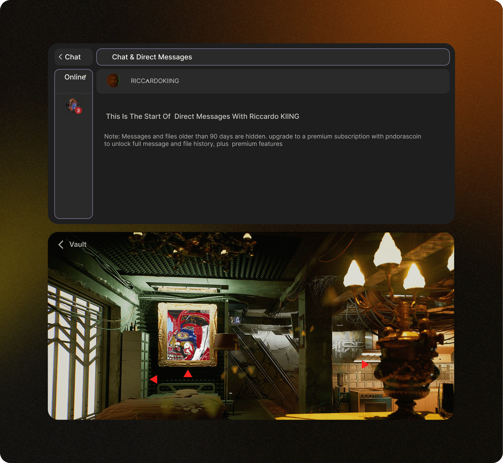 This high-fidelity mockup captures the personal dimension of the user’s virtual space. By clicking on a fellow community member, users can chat, fostering social connection. Meanwhile, we showcase the user’s vault, a curated apartment filled with collectibles like paintings and decor, representing their achievements and style. This seamless integration of communication and personalization brings the metaverse to life, allowing users to both express themselves and engage meaningfully.